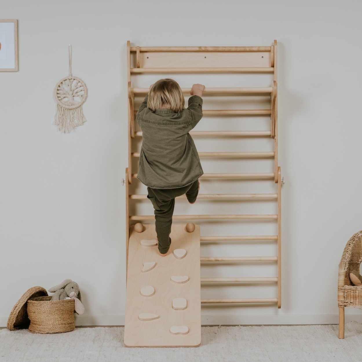 Reguliuojamas rampos pasvirimo kampas ir tekstūruoti laipiojimo akmenėliai suteikia begales žaidimo galimybių – nuo švelnių nuolydžių mažyliams iki įdomesnių iššūkių vyresniems vaikams.