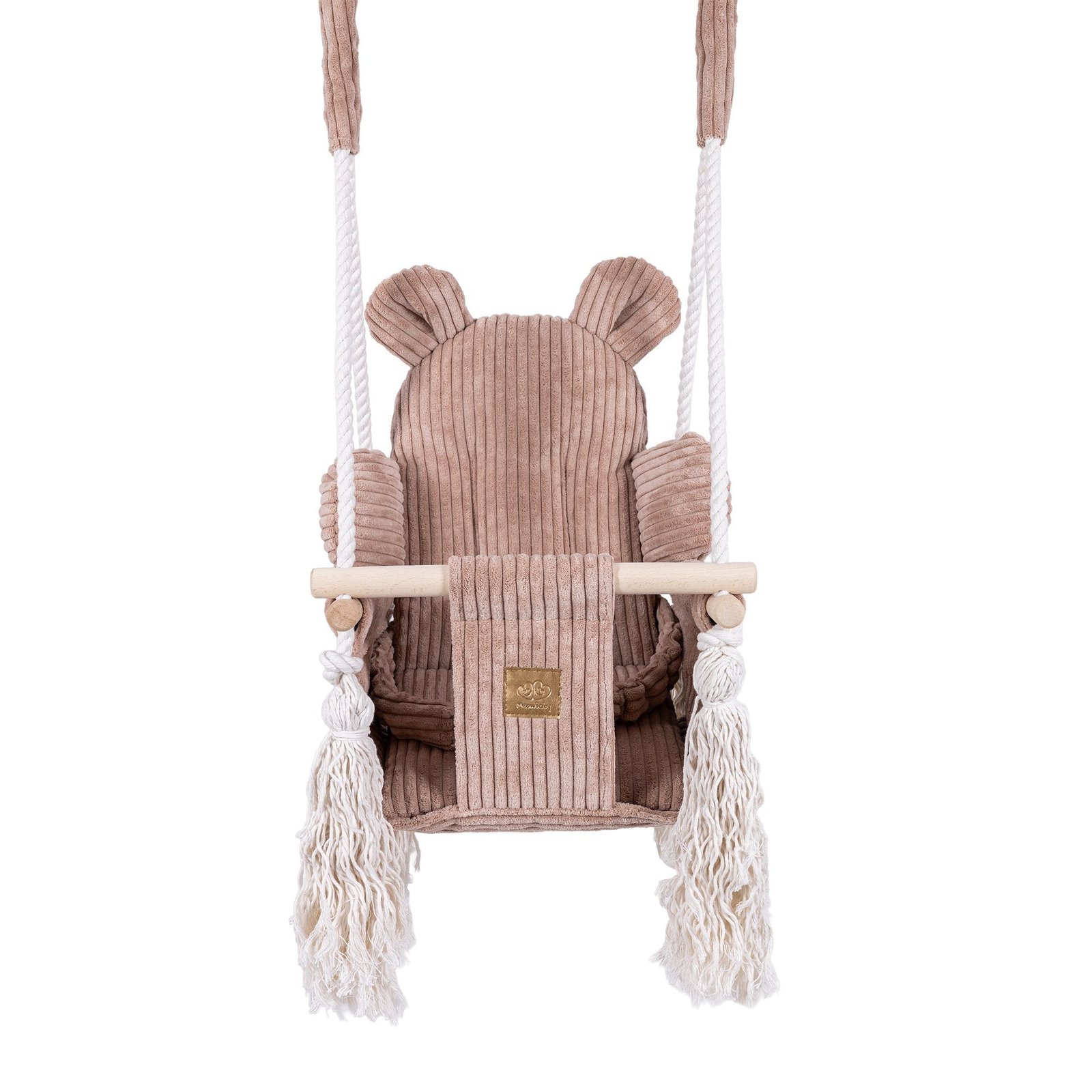 Jaukios ir saugios vidaus sūpynės, pagamintos iš natūralaus medžio ir minkštos medvilnės. Padeda lavinti pusiausvyrą ir koordinaciją, ramina mažylį. Su paminkštinta sėdyne ir saugos diržu – patikimas, stilingas akcentas vaikų kambariui.
